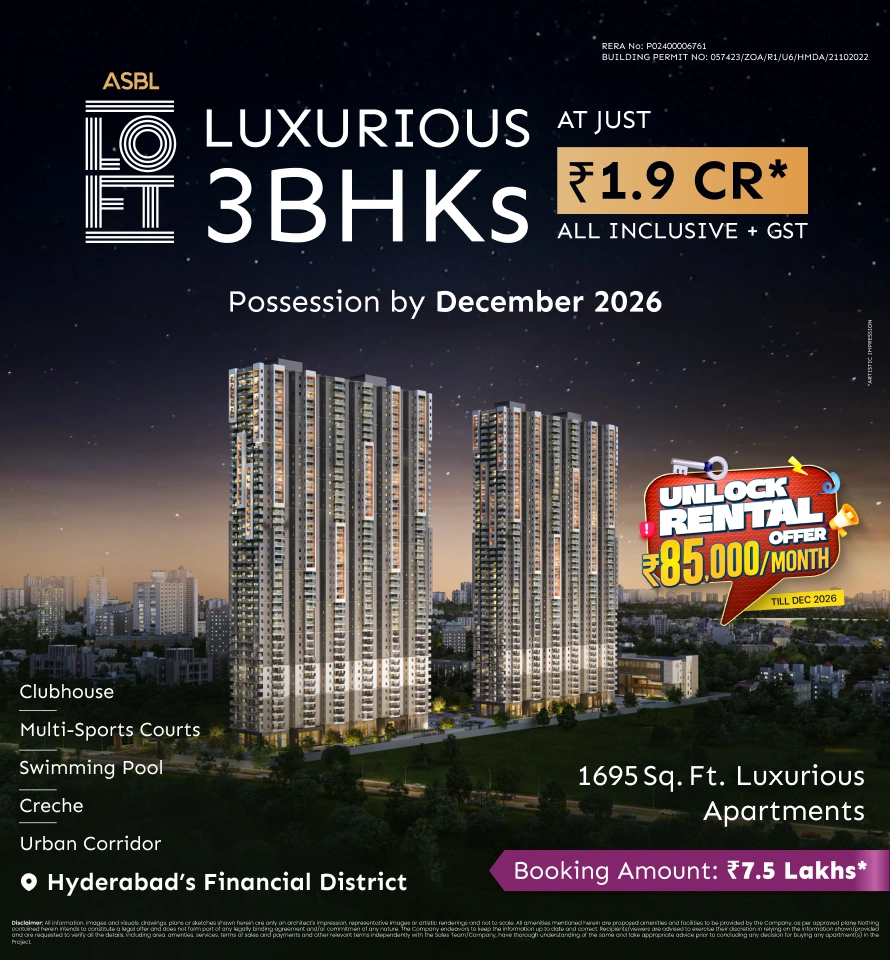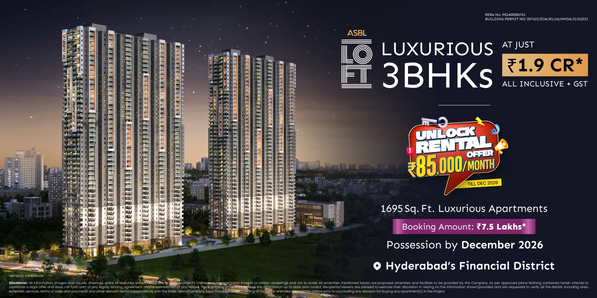ASBL Loft rises in Hyderabad’s Financial District with 3 BHK homes that stretch wide, soar higher, and open to generous balconies. Priced at ₹1.9 Cr with assured rentals of ₹85,000 a month, and handover in December 2026, it’s as much an investment as it is a lifestyle.